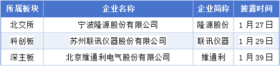 1月26日至2月1日期间,宁波隆源股份有限公司、苏州联讯仪器股份有限公司、北京维通利电气股份有限公司取得了注册批文。