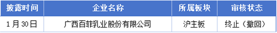 1月26日至2月1日期间,广西百菲乳业股份有限公司终止(撤回)了IPO。