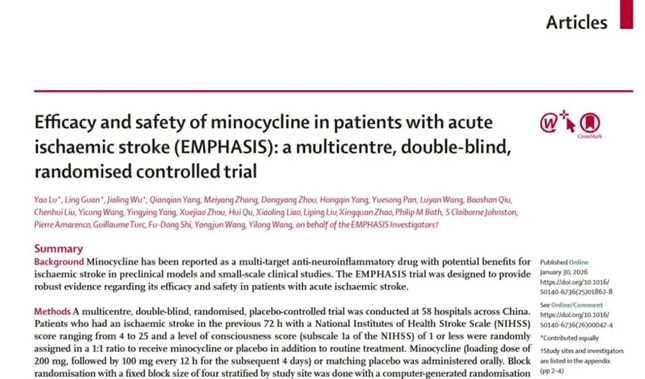 2026年1月31日,首都医科大学附属北京天坛医院王伊龙教授团队在《The Lancet》发表了题为“Efficacy and safety of minocycline in patients with acute ischaemic stroke (EMPHASIS): a multicentre, double-blind, randomised controlled trial”的研究论文。该研究显示,针对发病72小时内的缺血性卒中患者,在临床常规治疗基础上,给予为期4.5天的短程口服米诺环素治疗,可显著提高患者90天良好功能预后的比例,且具有良好的安全性。首都医科大学附属北京天坛医院王伊龙教授为通讯作者。