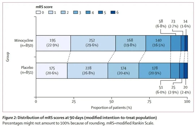 研究显示,与安慰剂组相比,米诺环素治疗可显著提高患者90天良好功能预后比例(52.6% vs. 47.4%, adjusted RR 1.11, 95% CI 1.03–1.20; p=0.0061; 图2)及功能独立的比例(72.4% vs. 67.8%, adjusted RR 1.07, 95% CI 1.02–1.12; p=0.0056; 图2),且米诺环素组患者整体功能障碍程度明显减轻(adjusted common OR 1.19, 1.03–1.38; p=0.018; 图2)。在随机化6天时,米诺环素组患者基于NIHSS评分的神经功能缺损改善幅度显著优于安慰剂组(adjusted β -0.28, 95% CI -0.50 to -0.05; p=0.015)。