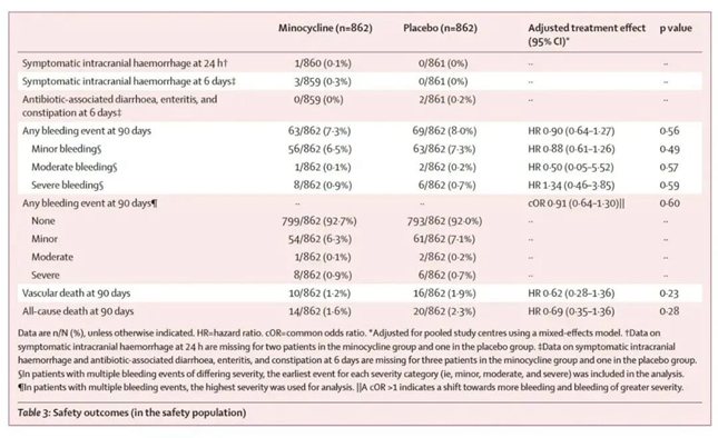 安全性分析结果显示(图3),米诺环素组和安慰剂组在24小时症状性颅内出血(0.1% vs 0%)、6天症状性颅内出血(0.3% vs 0%)、严重不良事件(4.6% vs 5.9%,p=0.24)等安全性结局的发生率方面均未观察到显著差异,提示短程口服米诺环素治疗具有良好的安全性。