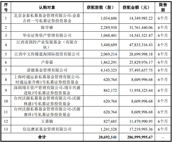 据公开资料显示,科翔股份本次发行对象最终确定为13家。本次向特定对象发行的股份,自发行股份上市之日起6个月内不得转让,自2026年2月5日起开始计算。公司本次发行募集资金总额286,999,995.67元,募集资金净额为277,057,443.96元。
