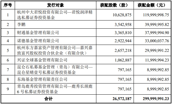 据公开资料显示,永创智能本次发行对象最终确定为9名。发行对象认购的本次发行的股份,自本次发行上市之日起6个月内不得转让。公司本次发行募集资金总额299,999,991.23元,募集资金净额为296,047,161.05元。