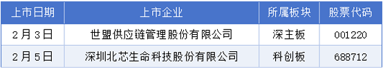 2月2日至2月8日期间,世盟供应链管理股份有限公司、深圳北芯生命科技股份有限公司挂牌上市。
