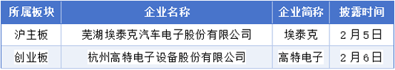 2月2日至2月8日期间,芜湖埃泰克汽车电子股份有限公司、杭州高特电子设备股份有限公司取得了注册批文。
