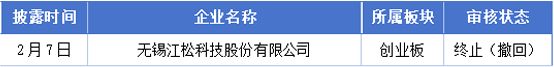 2月2日至2月8日期间,无锡江松科技股份有限公司终止(撤回)了IPO。