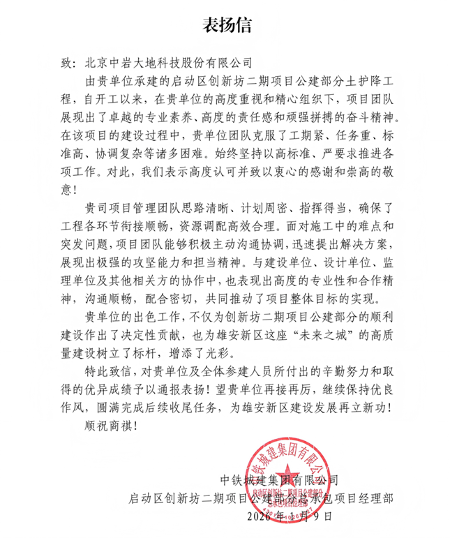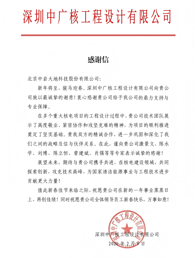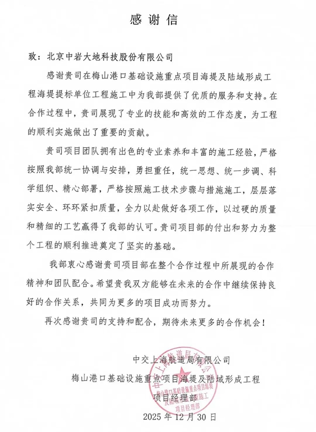 新春将至,北京中岩大地科技股份有限公司(以下简称“中岩大地”)接连收获来自深圳中广核工程设计有限公司、中交上海航道局有限公司、中铁城建集团有限公司等多方发来的感谢信与表扬信,信中对公司参建团队的专业实力、责任担当与协同精神予以高度赞誉。