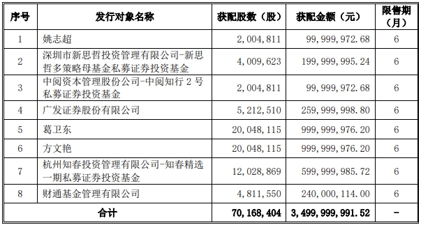 据公开资料显示,江淮汽车本次发行对象最终确定为8家。本次向特定对象发行股票完成后,发行对象所认购的股份自发行结束之日起六个月内不得转让。公司本次发行募集资金总额3,499,999,991.52元,募集资金净额为3,479,984,117.39元。