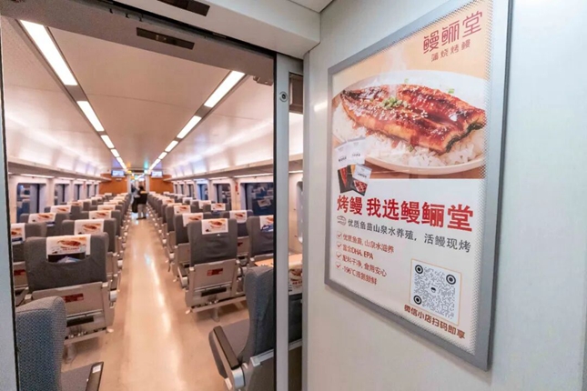 本次投放深度覆盖了以上海为中心的长三角经济圈、以福州为中心的福建大本营、以及粤港澳大湾区三大核心增长极,并延伸至重庆、山东等潜力市场。通过多组数、高频次的密集投放,鳗鲡堂的品牌形象在D3107/D3108(上海-深圳)、D2216(上海-重庆)、D2152(上海-威海)、D3125(扬州-深圳)等数十趟国民级黄金干线上惊艳亮相。