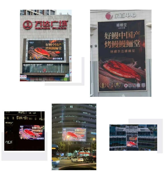 通过多点联动的地标传播,鳗鲡堂不仅点亮了城市夜空,更将“好鳗中国产 烤鳗鳗鲡堂”的品牌认知植入人心,引爆春节年货消费市场。