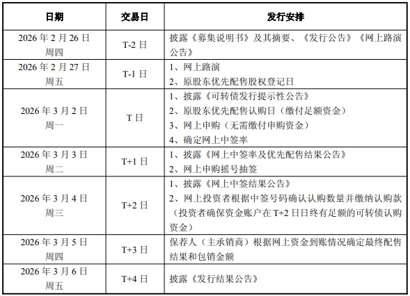 中国上市公司网讯 2月26日,深圳市泛海统联精密制造股份有限公司(股票简称:统联精密,股票代码:688210)披露了向不特定对象发行可转换公司债券发行公告,公司具体的发行安排如下表所示: