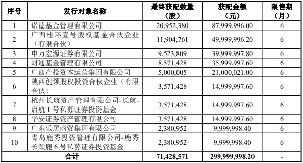 据公开资料显示,柳钢股份本次发行对象最终确定为10家。发行对象认购的本次发行的股份,自本次发行上市之日起6个月内不得转让。公司本次发行募集资金总额299,999,998.20元,募集资金净额为297,744,950.37元。