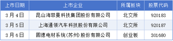 3月2日至3月8日期间,昆山海菲曼科技集团股份有限公司、上海通领汽车科技股份有限公司、固德电材系统(苏州)股份有限公司挂牌上市。