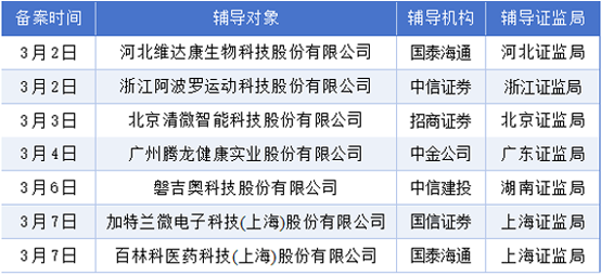 3月2日至3月8日期间新增辅导备案企业7家,分别为河北维达康生物科技股份有限公司、浙江阿波罗运动科技股份有限公司、北京清微智能科技股份有限公司、广州腾龙健康实业股份有限公司、磐吉奥科技股份有限公司、加特兰微电子科技(上海)股份有限公司、百林科医药科技(上海)股份有限公司