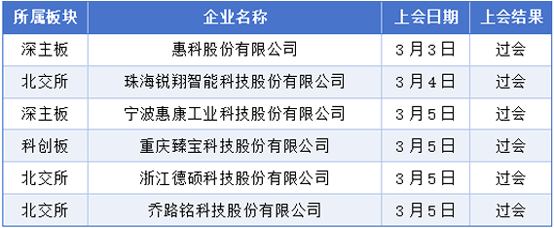 3月2日至3月8日期间,惠科股份有限公司、珠海锐翔智能科技股份有限公司、宁波惠康工业科技股份有限公司、重庆臻宝科技股份有限公司、浙江德硕科技股份有限公司、乔路铭科技股份有限公司成功通过了审核流程。