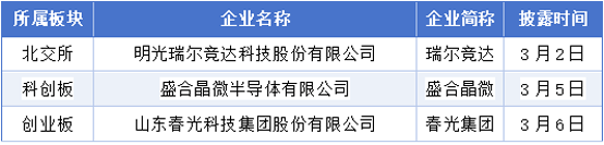 3月2日至3月8日期间,明光瑞尔竞达科技股份有限公司、盛合晶微半导体有限公司、山东春光科技集团股份有限公司取得注册批文。