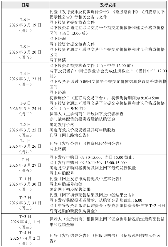 红板科技IPO发行安排 ID010 来源: 本网编辑 2026年3月19日 9:39 阅读(914) 评论(0) 中国上市公司网讯 3月19日,江西红板科技股份有限公司披露了首次公开发行股票发行安排及初步询价公告,公司具体的发行安排如下表所示: 中国上市公司网讯 3月19日,江西红板科技股份有限公司披露了首次公开发行股票发行安排及初步询价公告,公司具体的发行安排如下表所示: 风险提示:股市有风险,投资需谨慎,以上内容仅供投资者参考,不作为投资决策的依据。转载请注明出处: http://www.ipo123.com.cn/archives/75947 标签:红板科技 IPO 发行安排