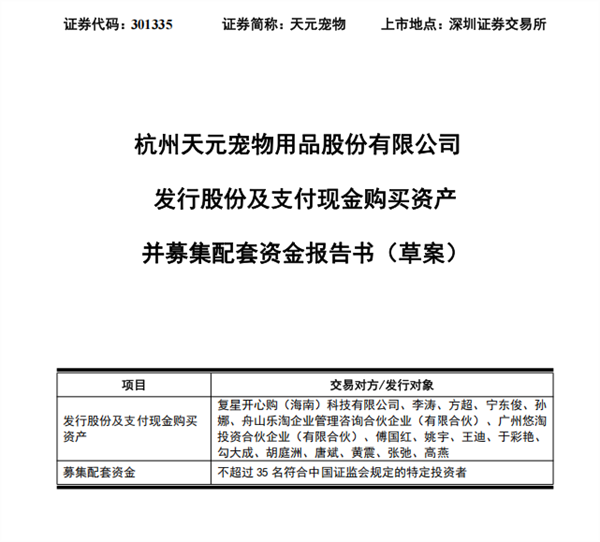 根据最新披露的重组方案,天元宠物拟通过发行股份及支付现金的方式,购买复星开心购、李涛、方超等合计持有的淘通科技89.7145%股权。本次交易总对价中,以发行股份方式支付的对价金额为22,422.94万元,以现金方式支付的对价金额为41,598.60万元。