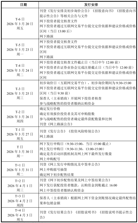 有研复材IPO发行安排 ID010 来源: 本网编辑 2026年3月20日 13:24 阅读(935) 评论(0) 中国上市公司网讯 3月20日,有研金属复合材料(北京)股份公司披露了首次公开发行股票发行安排及初步询价公告,公司具体的发行安排如下表所示: 中国上市公司网讯 3月20日,有研金属复合材料(北京)股份公司披露了首次公开发行股票发行安排及初步询价公告,公司具体的发行安排如下表所示: 风险提示:股市有风险,投资需谨慎,以上内容仅供投资者参考,不作为投资决策的依据。转载请注明出处: http://www.ipo123.com.cn/archives/76041 标签:有研复材 IPO 发行安排