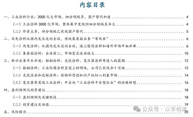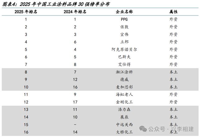 根据涂界,2024年中国工业涂料市场规模3024亿元,同比+5%,呈现“整体分散、但细分领域集中度高”的格局;外资仍占优势,国内前七强均为外资品牌,但民族品牌在风电、集装箱等领域已突破外资品牌的长期封锁,新一轮的国产替代浪潮正在酝酿。