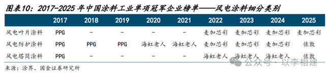 风电涂料:麦加芯彩、海虹老人、佐敦、阿克苏诺贝尔、PPG、福斯特、西北永新等少数品牌合计占据超90%份额。