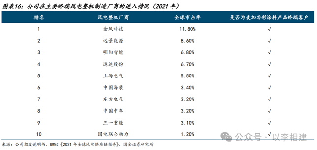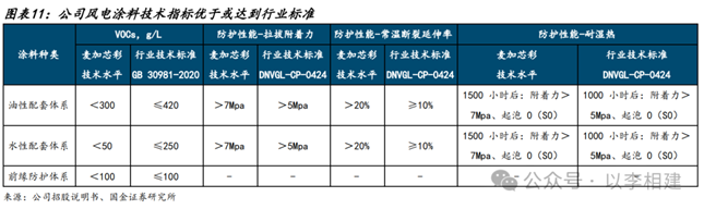 公司于2009年开始自主研发风电叶片涂料产品,2010年推向市场,开始切入风电叶片涂料业务,并于2016年推出环保类水性风电叶片涂料产品。风电行业技术迭代更新快速、市场竞争激烈,公司以持续不断的产品创新能力,持续居于国内市场龙头地位。根据公司测算,2020-2021年国内风电叶片涂料领域公司市占率分别达到31.06%、31.48%,在风电涂料领域已成功突破外资垄断。根据《涂界》发布的中国涂料工业单项冠军企业榜单,麦加芯彩2022-2024年连续三年取得国内风电防护涂料及风电叶片涂料的单项冠军,2025年第四年蝉联风电叶片涂料单项冠军。