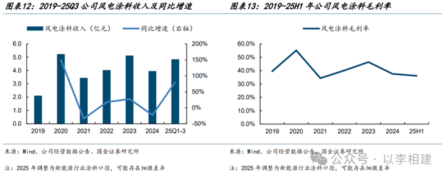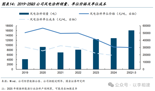 受益行业高景气、公司风电涂料销量增长,当前价格和毛利率已止跌企稳。2024年公司风电涂料收入3.9亿元,同比-23%,毛利率37.5%,同比-8.8pct,主因风电涂料价格下降,公司平均单价3.07万元/吨,同比-25%,而销量1.28万吨,同比+3%。25Q1-Q3,新能源行业涂料(主要为风电涂料)收入实现4.8亿元,同比+80%,其中销量1.60万吨,同比+80%,平均单价3.00万元/吨,同比-2%,受益风电装机高景气,预计2025全年销量大幅提升,价格有望止跌企稳、毛利率恢复稳定。