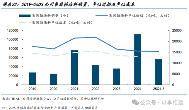 公司集装箱涂料收入呈现强周期波动。2024年红海危机引发短期集装箱涂料需求扩大,公司集装箱涂料收入17.3亿元,同比+196%,2025年事件扰动消退后,涂料需求相应回落,25Q1-3海洋装备行业涂料(主要为集装箱涂料)收入8.6亿元,同比-22%,其中销量5.60万吨,同比-22%,平均单价1.54万元/吨,同比-1%,平均单价和毛利率已趋于稳定。