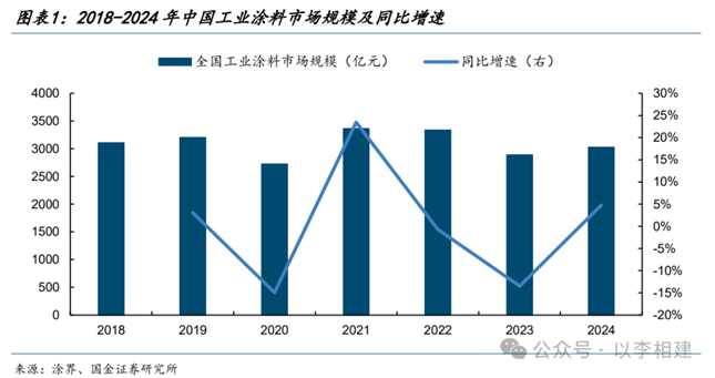 工业涂料广泛应用于汽车、船舶、集装箱、风电核电、轨道交通、航空航天、海工港口、石化装备以及3C家电、包装铝型材等多元领域,具备技术密集与高附加值的特征。据涂界数据研究实验室统计,2024年全国工业涂料市场规模约3024亿元,同比+5%。