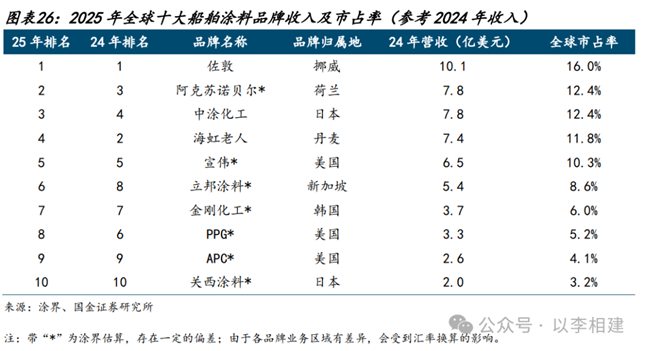 外资品牌占据绝大部分市场,但国产替代进程正在加速。从竞争格局来看,根据涂界的统计,全球主流船舶涂料品牌高度集中在欧美日韩等船舶工业发源地及发达地区。这些国际巨头凭借深厚的技术积淀、完善的服务网络、强大的品牌影响力及资金优势,通过持续的全球并购不断扩张,垄断全球船舶涂料市场,2025年全球船舶涂料CR10约为90%。