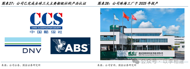 (1)公司风电叶片涂料20-21年份额31%-32%(根据招股书),下游涵盖叶片厂、整机厂,准入壁垒高。国金电新预计26年全球/中国风电新增装机同比+16%/10%,27年+7%/+6%,延续高景气。公司24年取得NORDEX认证后,25年批量销售,海上塔筒NORSOK M501测试中,以此为契机,未来在海外整机厂的覆盖有望继续扩大。