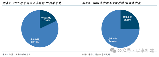 整体市场集中度显著偏低。依托庞大的制造和消费市场,我国工业涂料行业整体市场空间可观,但细分赛道众多、参与者庞杂,尚未形成绝对主导的格局;据涂界统计,2025年全国工业涂料CR10仅为17.90%,CR30仅为25.56%。