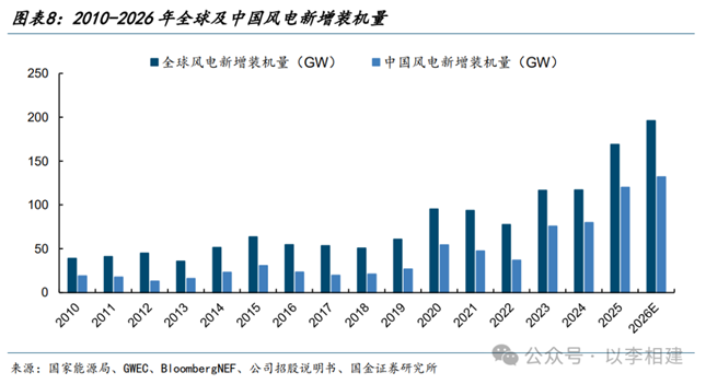 政策层面,“十五五”规划纲要提出,要推进非化石能源安全可靠有序替代化石能源,坚持风光水核等多能并举,实施非化石能源十年倍增行动。2025年北京国际风能大会暨展览会上,风电行业发布《风能北京宣言2.0》,提出“十五五”时期我国风电年新增装机不低于120GW,到2030年累计装机达13亿千瓦、2035年不少于20亿千瓦、2060年达50亿千瓦的目标,国内风电产业链景气延续。