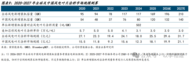 风电涂料的市场规模主要取决于下游风电整机设备新增装机量及风电设备修补存量,其中新增风电设备需求占主导。根据全球风能理事会(GWEC)、国家能源局和BloombergNEF,2025年全球/中国风电新增装机量分别169GW/120GW,均创历史新高,国金电新组进一步预测2026年全球/中国风电新增装机量分别同比+16%/+10%至196GW/132GW,2027年增速为+7%/+6%,延续高景气。公司公告显示,2020-2021年单位新增装机容量对应叶片涂料用量约502吨/GW,我们依照“风电新增装机*单位新增装机对应涂料用量*涂料价格”测算2026年全球/中国风电叶片涂料市场规模将增长至30/20亿元,分别同比+16%/+10%。