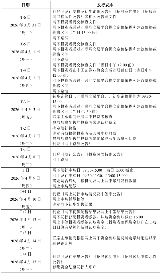 盛合晶微IPO发行安排 ID010 来源: 本网编辑 2026年3月31日 10:42 阅读(856) 评论(0) 中国上市公司网讯 3月31日,盛合晶微半导体有限公司披露了首次公开发行股票发行安排及初步询价公告,公司具体的发行安排如下表所示: 中国上市公司网讯 3月31日,盛合晶微半导体有限公司披露了首次公开发行股票发行安排及初步询价公告,公司具体的发行安排如下表所示: 风险提示:股市有风险,投资需谨慎,以上内容仅供投资者参考,不作为投资决策的依据。转载请注明出处: http://www.ipo123.com.cn/archives/76791 标签:盛合晶微 IPO 发行安排