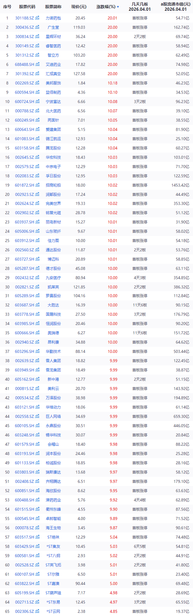 板块题材上,创新药、元件、游戏板块涨幅居前;轨交设备板块跌幅居前。 盘面上,创新药板块持续走强,广生堂、睿智医药20CM涨停封板,艾迪药业、诚达药业等数只个股涨超10%,北大医药、益佰制药等数只个股涨停。元件板块走强,本川智能、晶赛科技涨超10%,中京电子涨停封板。游戏板块震荡走强,完美世界、巨人网络涨停封板。轨交设备板块高开低走,交大铁发、通业科技跌超7%。