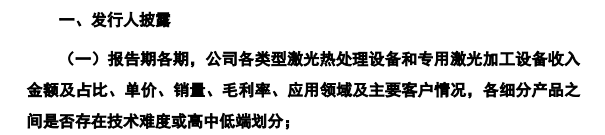 关于主要客户情况,公司问询回复中披露。公司产品已实现规模化应用,在先进制程集成电路激光热处理设备领域,公司客户覆盖晶合集成、华虹公司、中车时代、比亚迪半导体、捷捷微电、华润微、士兰微等国内主流半导体厂商,得到行业头部客户的认可。专用激光加工设备领域客户覆盖华天科技、比亚迪半导体、佰维存储、达迩科技、江波龙、捷捷微电、华润微等,核心产品凭借技术优势与稳定性能,与客户建立了长期合作关系,为业务持续发展提供了坚实支撑。