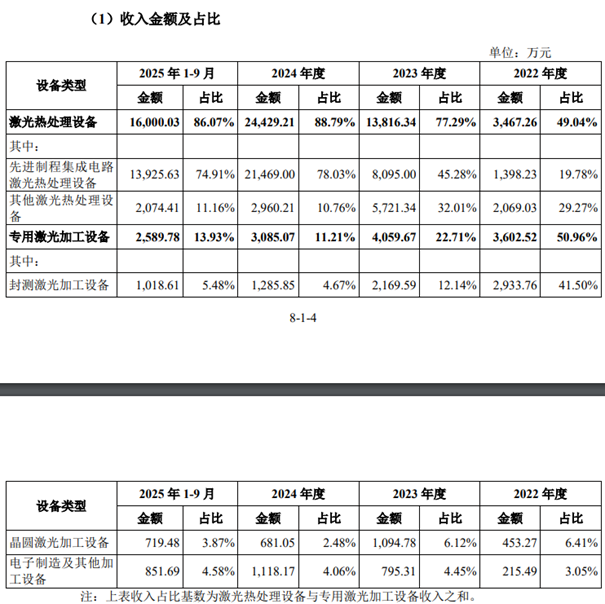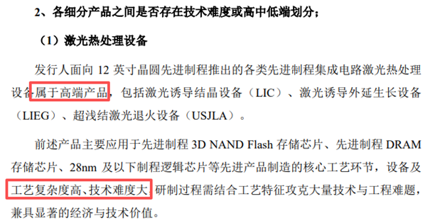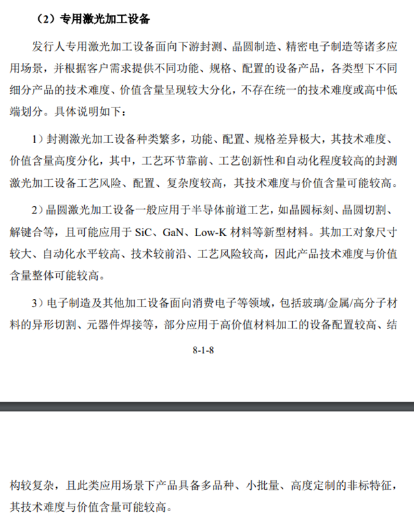 关于产品应用领域。公司激光热处理设备主要应用于存储芯片、先进制程逻辑芯片、功率芯片、图像芯片等领域,涵盖12英寸集成电路产线、先进封装产线,可适配3D NAND Flash存储芯片、28nm及以下先进制程逻辑芯片、SiC功率芯片等前沿产品的量产及研发场景。专用激光加工设备则面向封测、晶圆制造、精密电子制造等场景,可提供晶圆标刻、切割、解键合及玻璃、金属材料异形切割等服务,部分产品还延伸至MLED等产业领域。