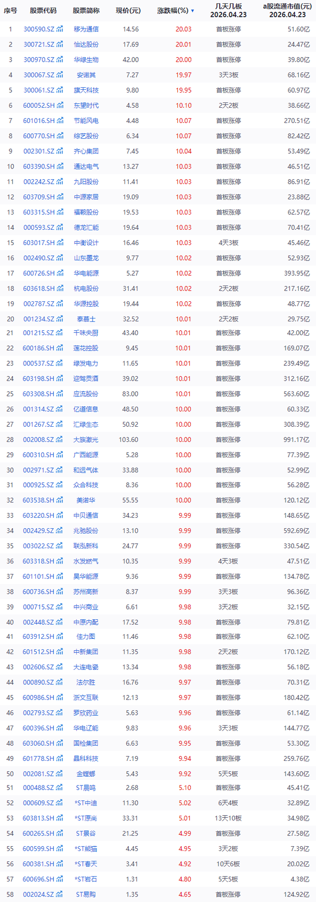 【2连板】泰慕士、东望时代、中新集团、水发燃气、杭电股份。