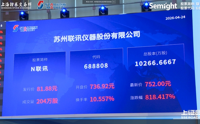 2026年4月24日,苏州联讯仪器股份有限公司(股票简称:联讯仪器,股票代码:688808)正式在上海证券交易所科创板挂牌上市。公司此次公开发行新股2566.6667万股,发行价为81.88元/股。网下询价阶段,机构投资者报价踊跃,泉果基金等机构报出110.16元/股的最高价,足见资本市场对这家高端测试仪器设备企业的高度认可。