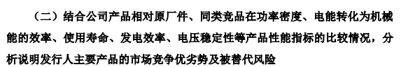 公司在成本控制及主要产品上与竞争对手相比具有明显优势,如公司产品在功率密度、能量转化效率、耐用性及电压稳定性等核心维度上与原厂件基本保持一致且优于竞争对手产品的性能。这些性能优势不仅构筑了较高的技术壁垒,更通过优异的使用体验与成本效益获得下游客户广泛认可,为公司巩固市场地位、拓展客户群体提供了坚实支撑。公司产品逐步打破了客户对原厂件品牌依赖的认知壁垒,提升了公司在细分领域的市场竞争力。并且公司通过与核心客户的深度绑定,降低被厂件或同类竞品替代风险。