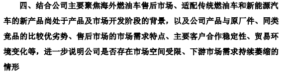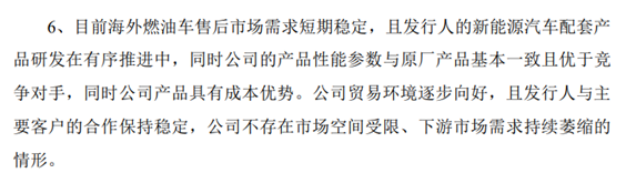公司明确回复公司现阶段海外燃油车售后市场,该下游市场短期内具备坚实的需求基础,不存在萎缩、下滑的风险。